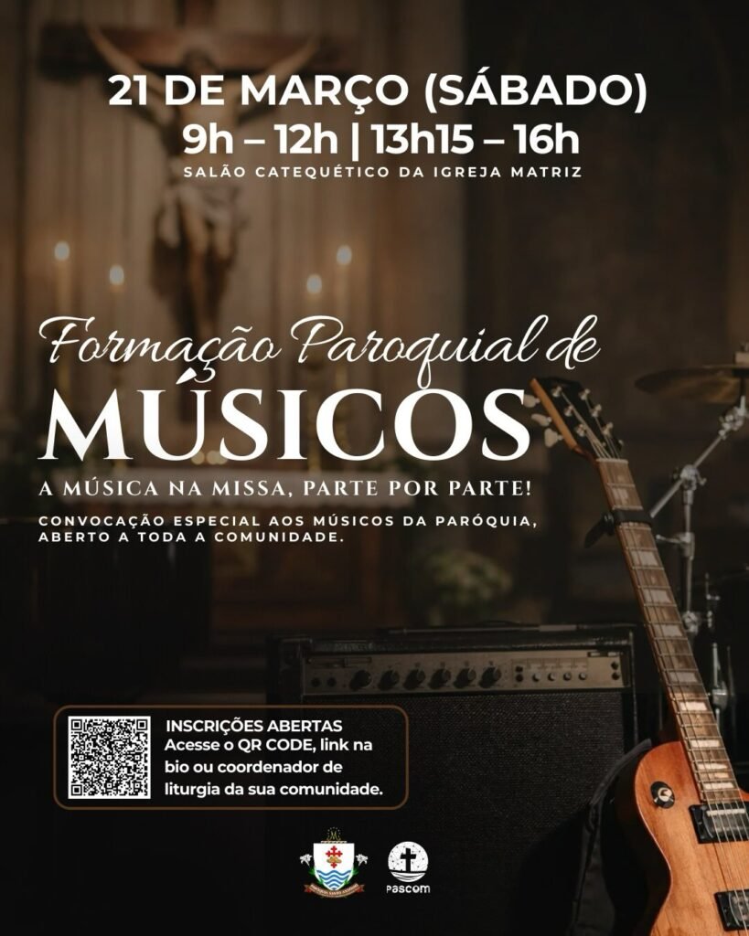 Convidamos todos os músicos que já servem em nossa paróquia cantores, instrumentistas e integrantes dos ministérios de música para um momento especial de formação, partilha e aprofundamento sobre a música na liturgia. E também está aberto a todos que desejam conhecer mais sobre a música litúrgica e seu verdadeiro sentido na celebração.