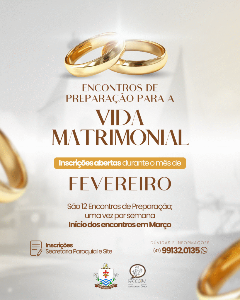 O matrimônio é um chamado ao amor verdadeiro, vivido na doação, no diálogo e na fé. Pensando nisso, a Paróquia Santo Antônio convida os casais a participarem dos Encontros de Preparação para a Vida Matrimonial, um caminho de formação, reflexão e amadurecimento para quem deseja construir a vida a dois sobre bases sólidas.