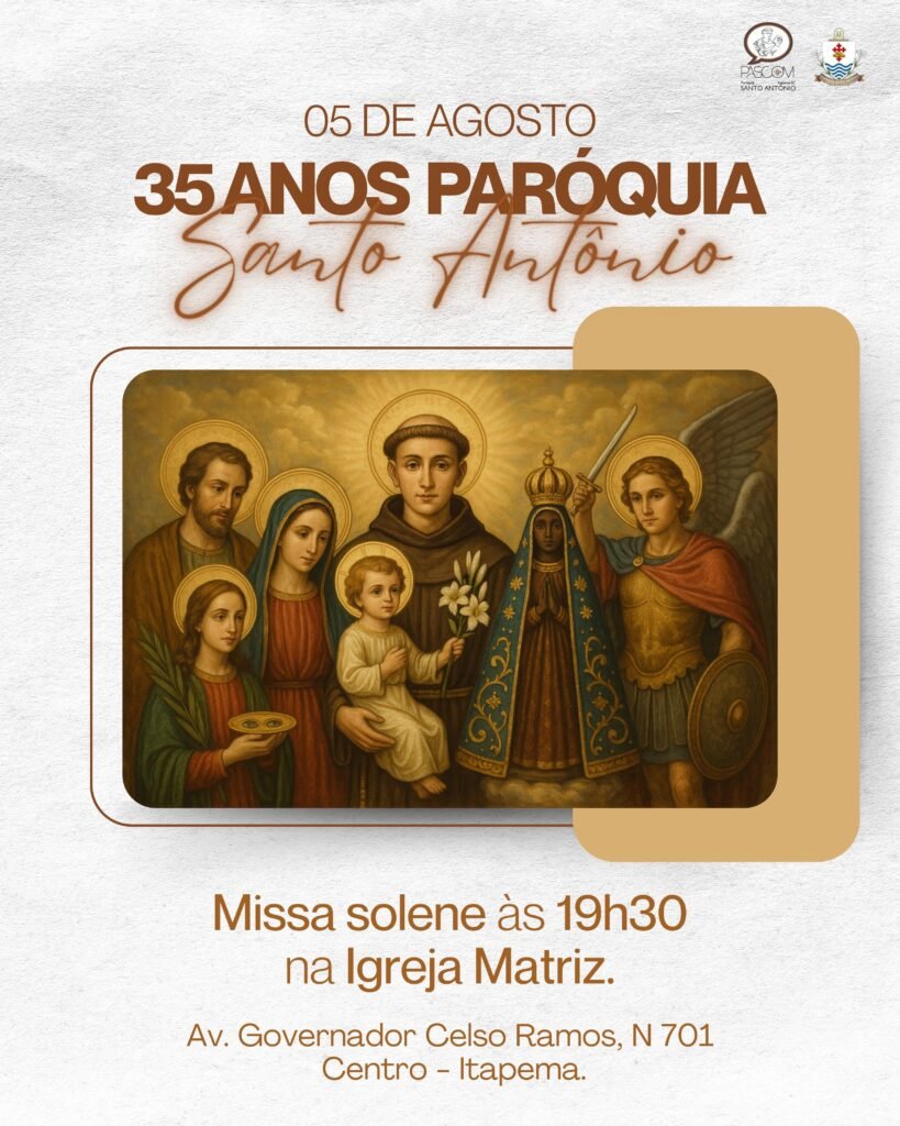 ✨ Festividade da Sagrada Família ✨“Quando falamos em exemplo de fé, sempre teremos a Sagrada Família como espelho.” 📅 Data: 17 de agosto⛪ Santa Missa: às 11h🍽️ Almoço festivo: a partir das 11h30 (churrasco e acompanhamentos – R$60,00)🎁 Tarde de prêmios: às 14h 📍 Comunidade Sagrada FamíliaRua 810B, Alto São Bento – Itapema/SC Venha celebrar conosco esse momento especial de fé, união e fraternidade! 🙏❤️