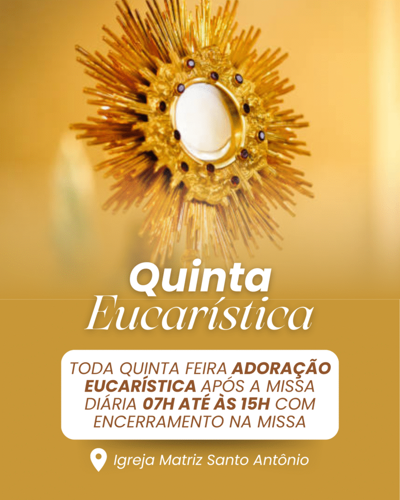 Toda quinta-feira, a Igreja Matriz se transforma em um santuário de adoração e encontro profundo com Jesus Eucarístico. Iniciamos o dia às 06h30 com a Santa Missa, que abre o nosso período de Adoração ao Santíssimo Sacramento